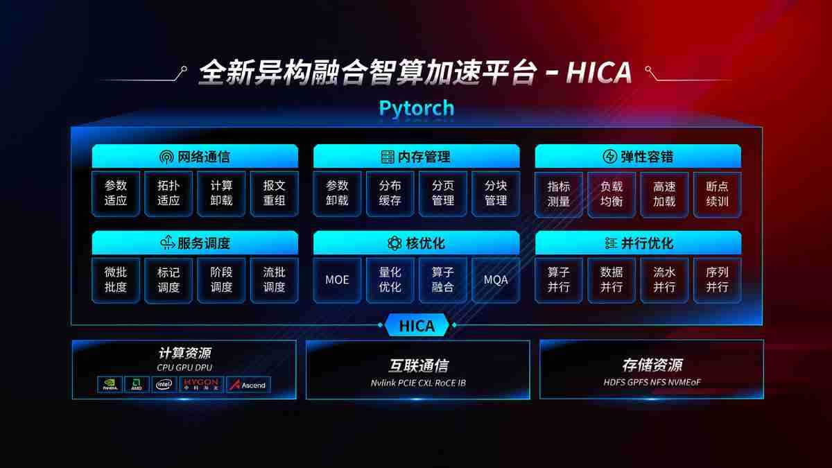 通过自研的服务层、、、中间适配层、、、以及调度编排算法,,采用数据并行、、、、模型并行等多种并行方式,,,,把并行计算任务进行有效的分解,,,,使其分别由相应的软件栈和算力资源来承接。。当GPU资源变化,,,,HICA可以实时动态调度计算子任务并调整模型拓扑和架构,,以充分聚合各种算力资源。。。