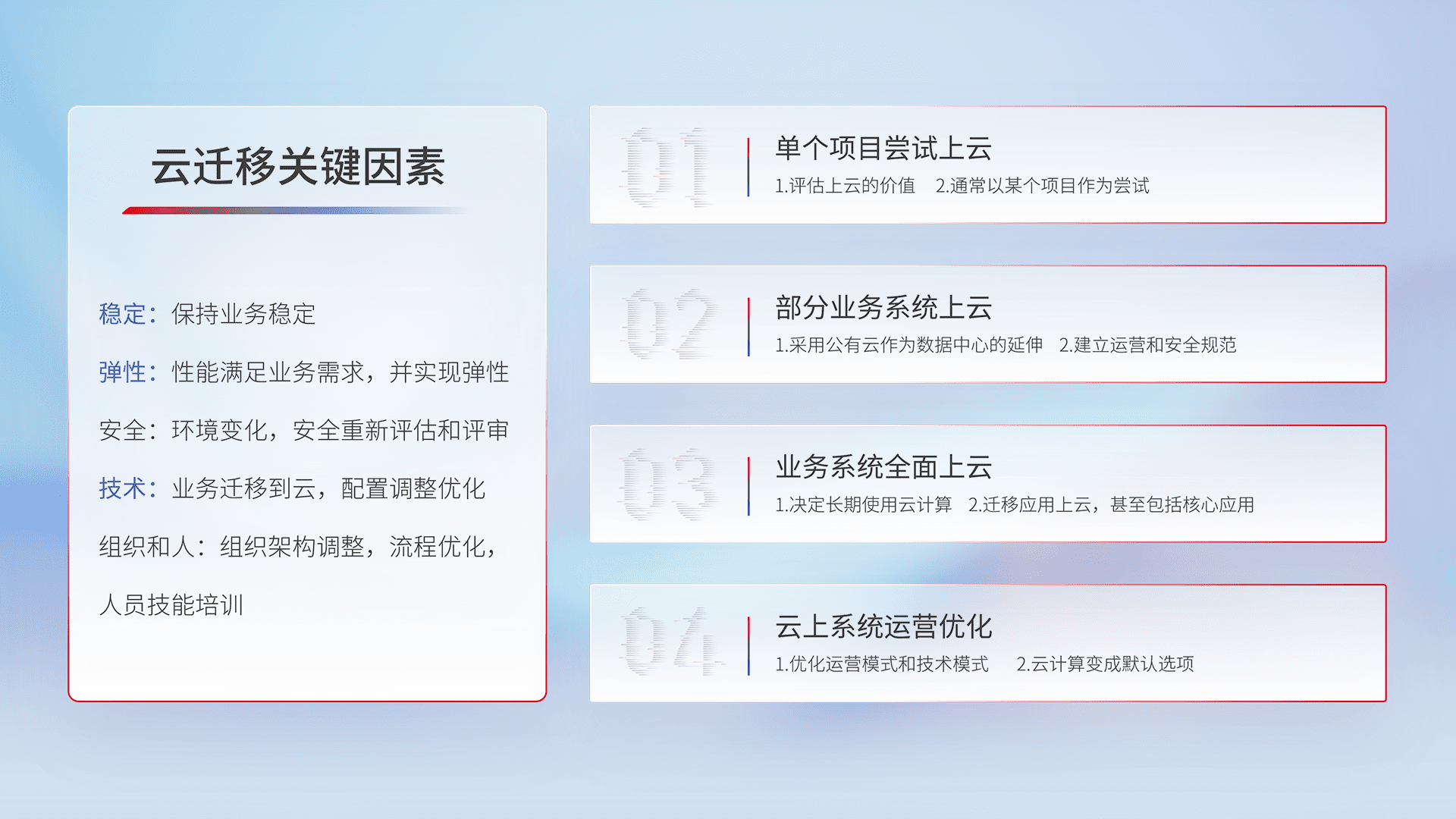 结合实际业务,,,,从规划设计、、、、云平台选型、、、云原生改造、、、、数据迁移、、、集成交付,,迁移全过程为客户识别最佳上云路径,,,,做好风险识别管理,,,,设计网络架构、、、、身份权限、、、安全审计合规、、、、操作审计、、、、日志审计、、、监控告警策略、、多站点容灾设计等,,,对云上基础设施进行整体规划,,提升IT治理水平,,以满足弹性、、、、高可用、、、、高性能的需求。。