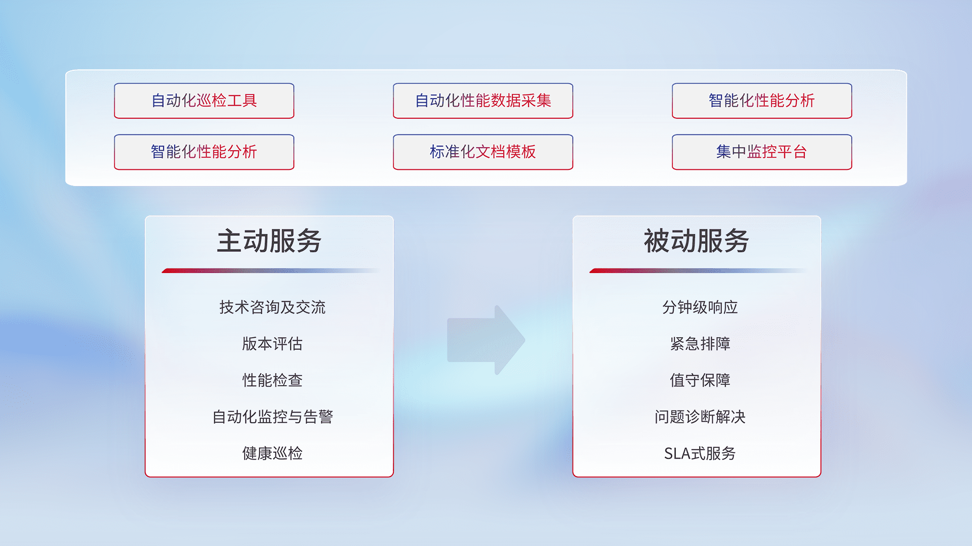 智能化工具和标准化文档,,保障服务质量,,,,提供主动服务(包含技术咨询、、、版本评估、、、、性能检查、、、自动化监控与告警、、、健康巡检)和被动服务包含(分钟级响应、、紧急排障、、、、值守保障、、问题诊断解决、、、SLA服务)。。。。